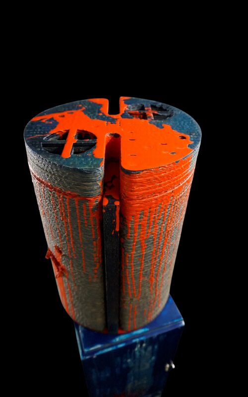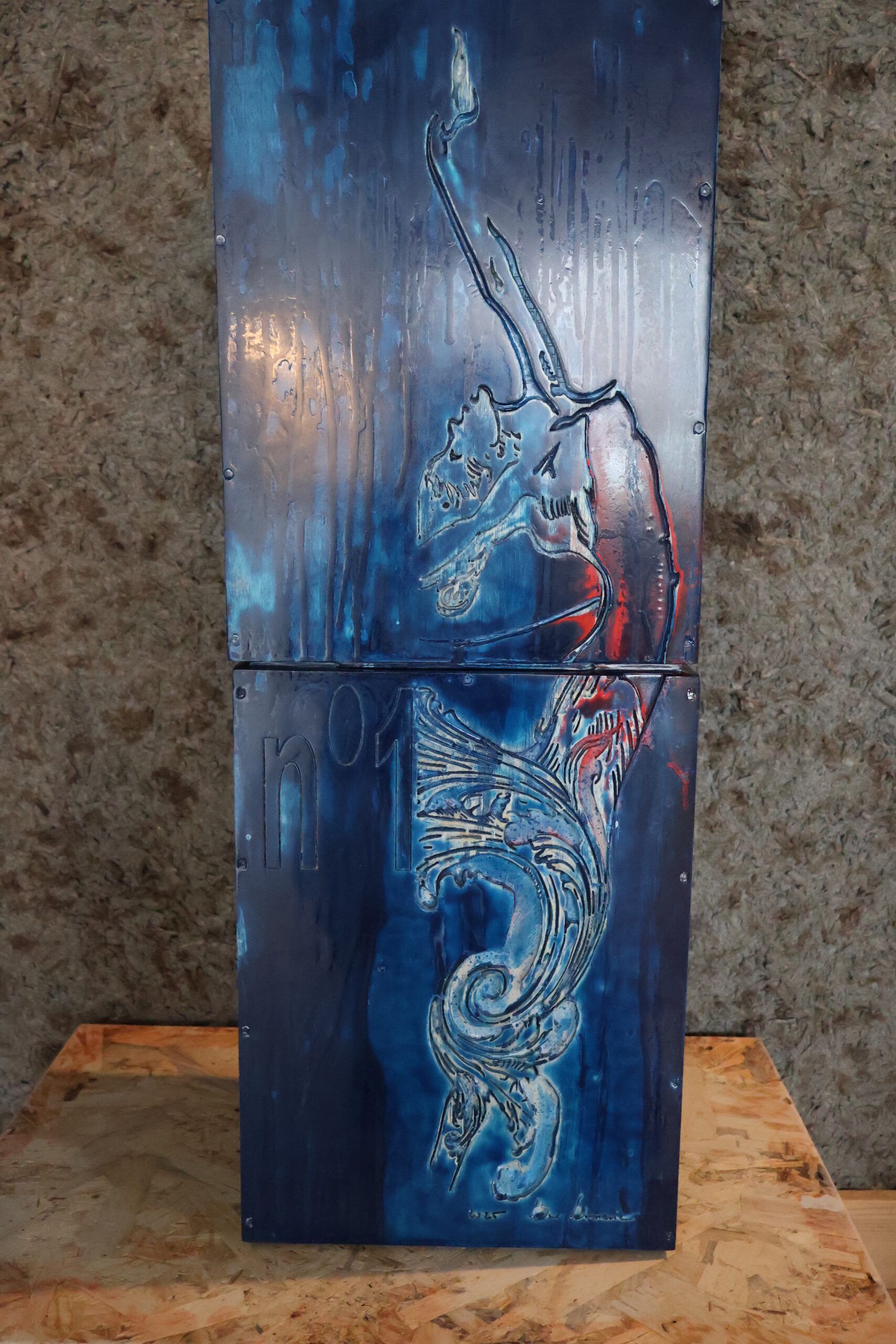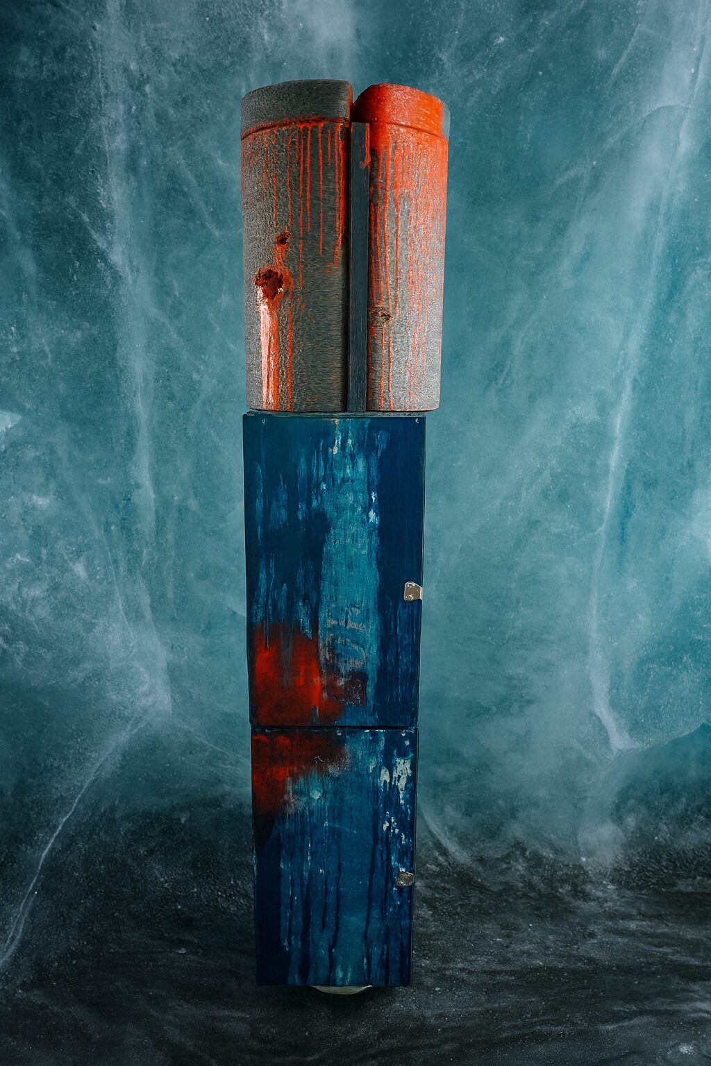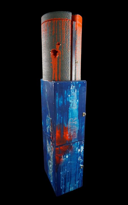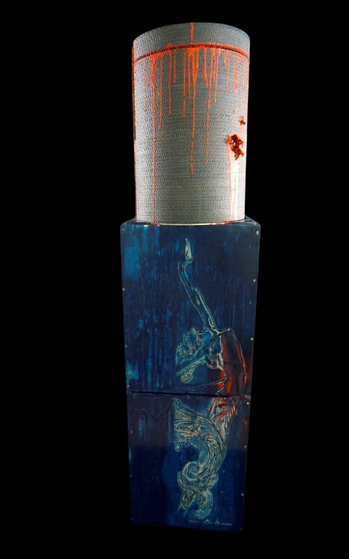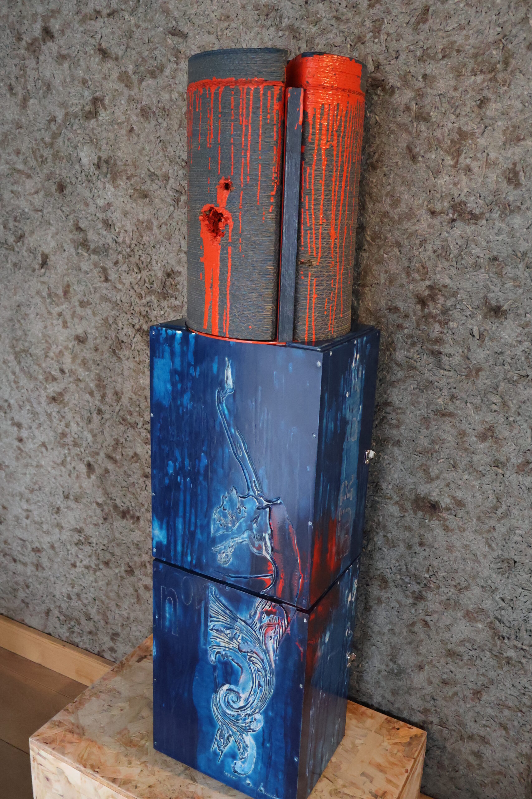 Ce monolithe possède un cœur en planche de chêne, planche de chêne elle-même peinte du damier de la vie.