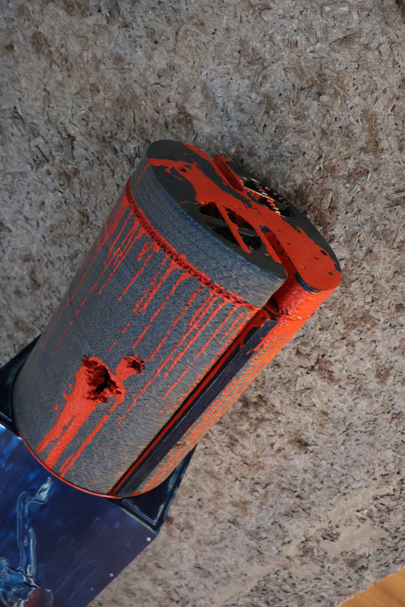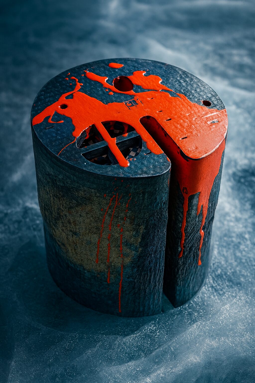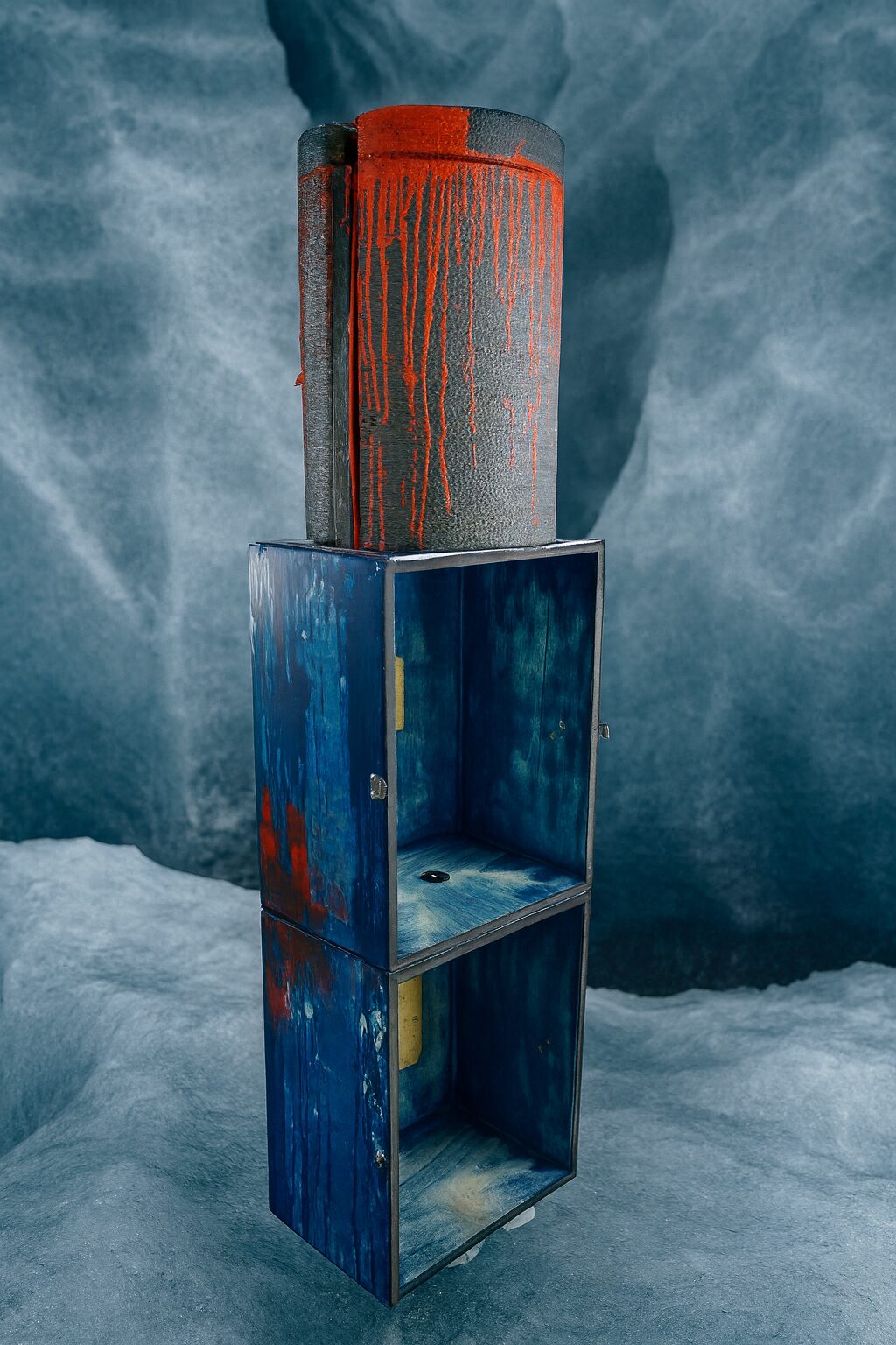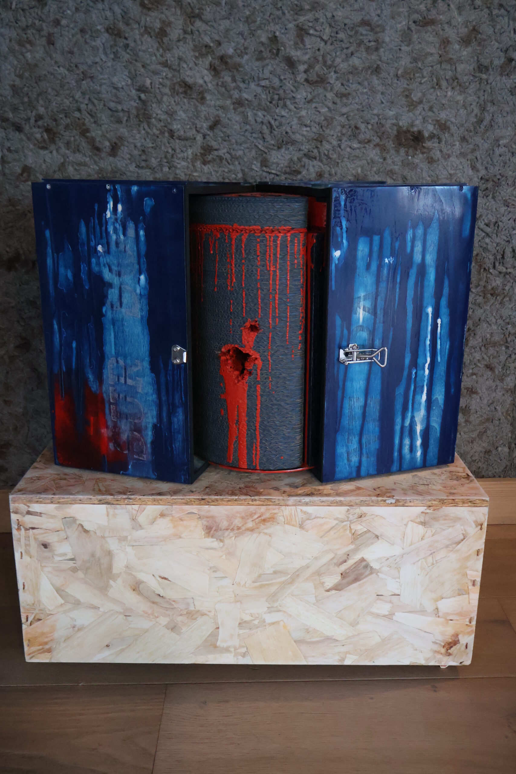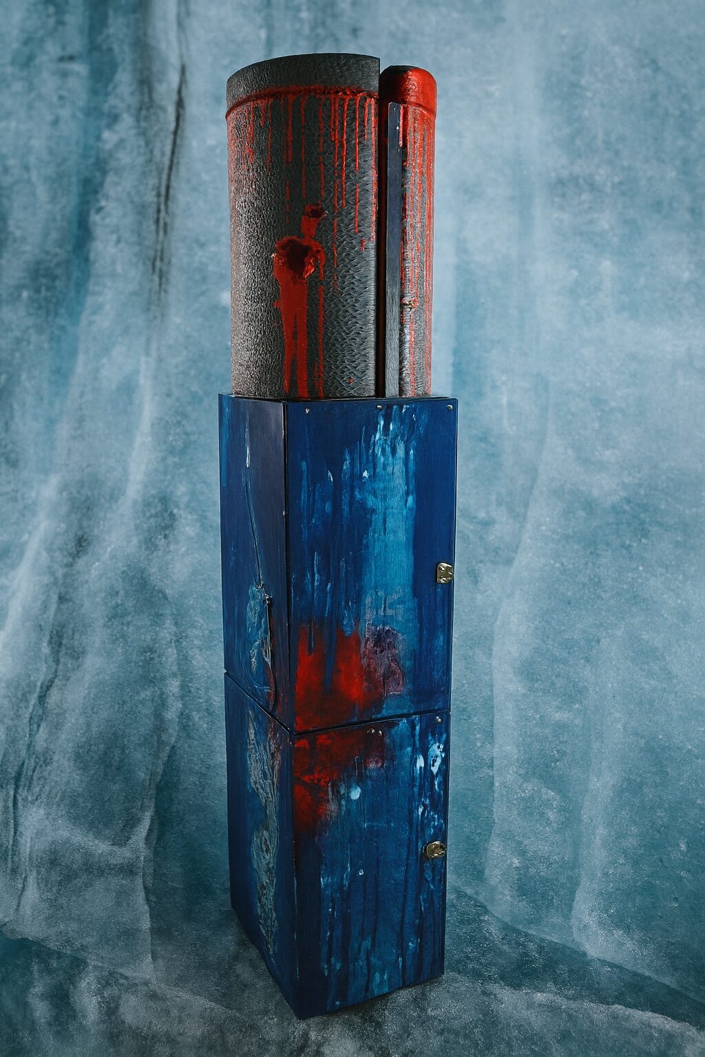 Ce monolithe possède un cœur en planche de chêne, planche de chêne elle-même peinte du damier de la vie.